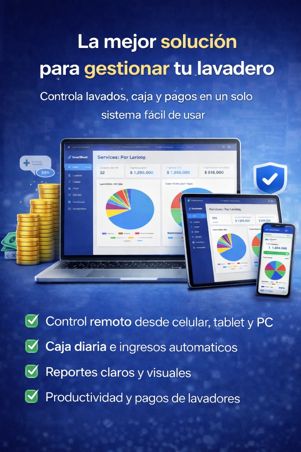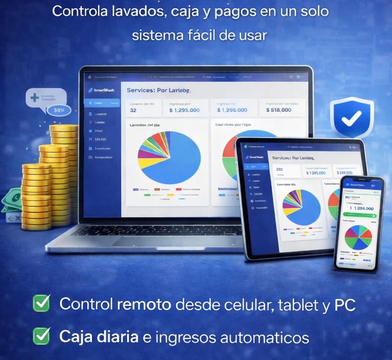 Gestiona lavados, caja, pagos, reportes y productividad de tu lavadero en un solo sistema, accesible desde cualquier dispositivo.